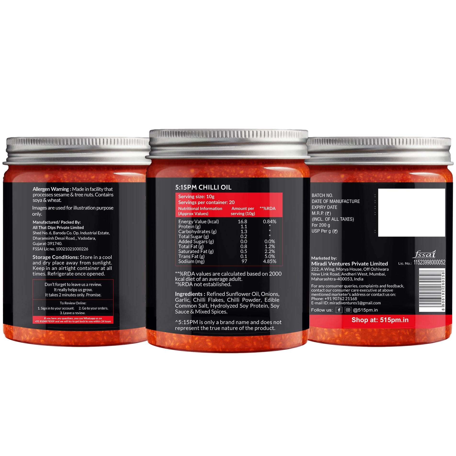 β INSTANT TASTE UPGRADE: With 5:15PM Chilli Oil you can literally improve your food in seconds. 5:15PM Chinese Chilli Oil is a perfect CONDIMENT for sautΓ©ing and finishing. Use it in marinades, dressings or sauces, its perfect for Healthy Salad eaters, perfect dip for dim sum, Momo, pizza's, etc.