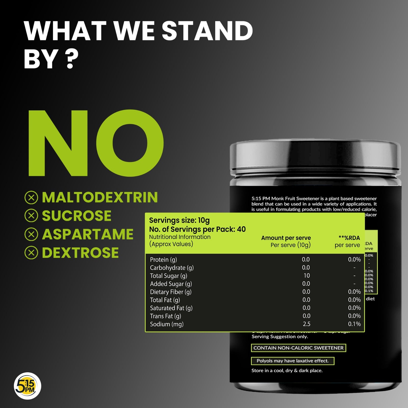 ✅ 𝐍𝐀𝐓𝐔𝐑𝐀𝐋 𝐌𝐎𝐍𝐊𝐅𝐑𝐔𝐈𝐓 𝐒𝐔𝐆𝐀𝐑 𝐒𝐔𝐁𝐒𝐓𝐈𝐓𝐔𝐓𝐄: The 5 :15PM Monk Fruit sugar Sweetener with Erythritol is a 1:1 sugar replacer, making it an ideal choice for cooking and baking. This monk fruit sweetener India product is zero sugar, zero calorie, and keto diet-friendly, allowing you to enjoy the monk sweetener without the negative impacts of traditional sugar.
